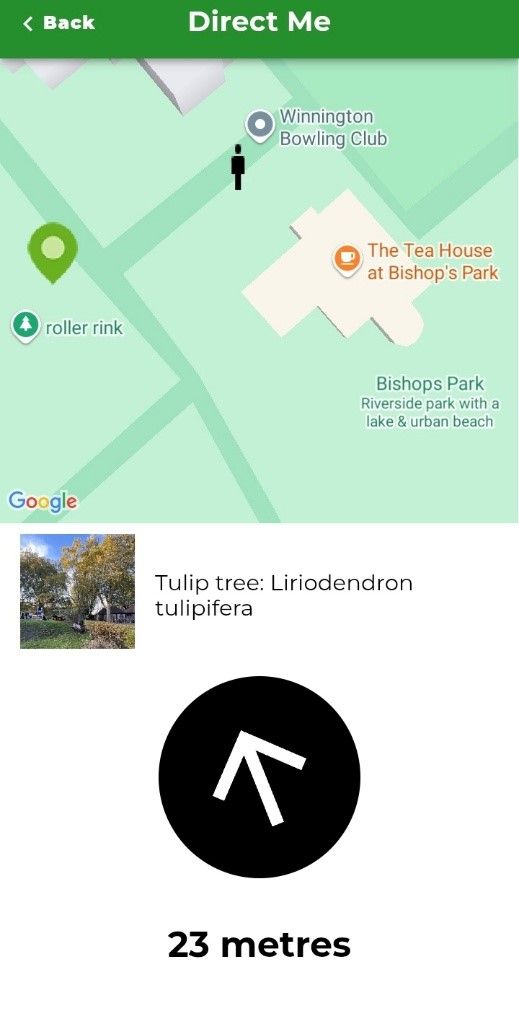 The Direct Me feature shows a live compass arrow and distance to each point of interest with a picture of it, so the user knows exactly what they are looking for – it’s a fun and easy way to find things accurately in a green space.